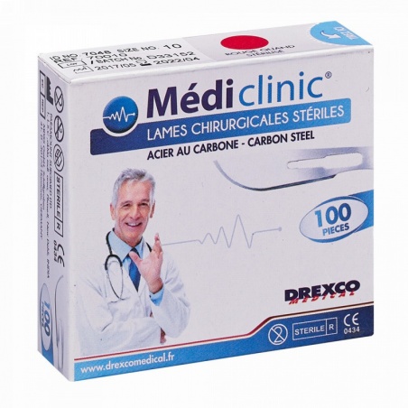 Lames stériles en acier inoxydable au carbone. Haute qualité. Tranchant exceptionnel. Elle s’adapte sur tous les manches de bistouris normes BS2982. Sachet pelable individuel en aluminium de sécurité. Stérilisation par rayon Gamma.