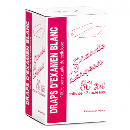 Rouleau d'examen 100% pure ouate de cellulose blanche 80 cm de large prédécoupé tous les 190 cm. 30 feuilles. Carton de 12 rouleaux.