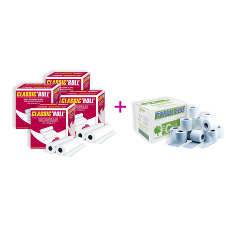 Rouleau d'examen 100% pure ouate de cellulose blanche 50 cm de large prédécoupé tous les 35 cm. 150 feuilles. Carton de 12 rouleaux. 2 plis 2x18g