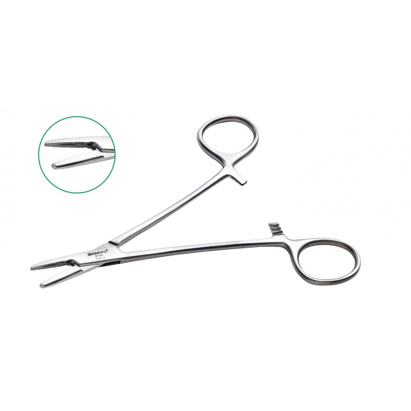 Le porte-aiguille Mayo-Hegar a une mâchoire courte, épaisse et rainurée qui maintient l'aiguille en toute sécurité tout en fermant la plaie.